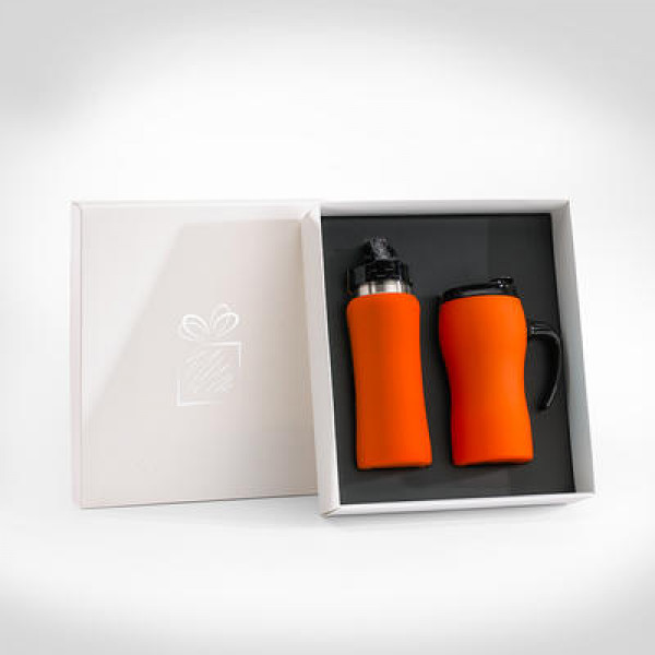Vrlo praktični set - termo šalica i bidon. Sudovi su pokriveni izvana mekanom na dodir gumiranom oblogom „soft touch”.Oba produkty wykonane od visokokvalitetnog nehrđajućeg čelika. Šalica ima dvostruke stjenke koje održavaju željenu temperaturu. Bidon opremljen usnikom i cijevi koje omogućuju pijenje u uspravnom položaju. Set je certificiran za kontakt s hranom, ima također certifikat BPA FREE. Set pakiran u elegantnu kutiju.
