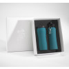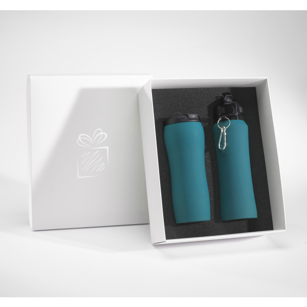 Vrlo praktični set - termo šalica i bidon. Sudovi su pokrivenih izvana mekanom na dodir gumiranom oblogom i izrađene od nehrđajućeg čelika. Šalica ima dvostruke stjenke koje održavaju željenu temperaturu. Bidon opremljen nosačem i usnikom s cijevi koje omogućuju pijenje u uspravnom položaju. Set je certificiran za kontakt s hranom, ima također certifikat BPA FREE. Set pakiran u elegantnu kutiju.